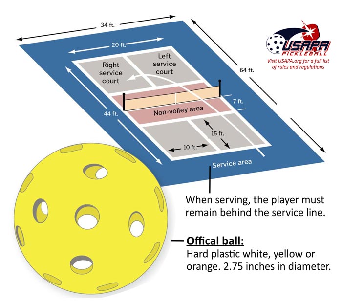 SERVING: Server starts in the right court and serves to the court diagonally opposite. The ball must travel past the non-volley area zone line. The receiver must let the ball bounce once before hitting it. One the first return of service, the server (or partner) must also let the ball bounce before hitting it. After that, players may also volley, unless they are standing in the non-volley area, “The Kitchen”